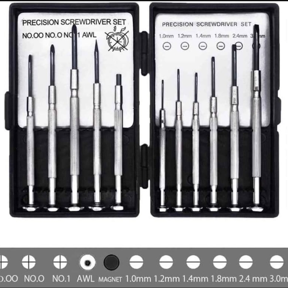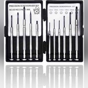 Complete precision screwdriver set with various sizes. Ideal for detailed work. Comes in a compact case.