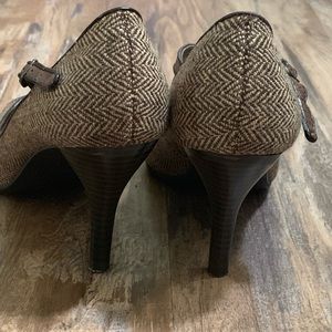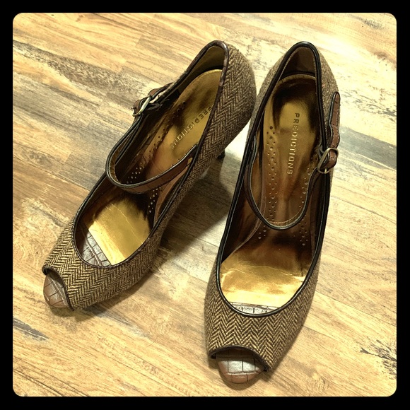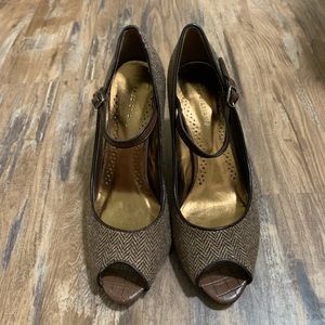 Predictions peep toe pumps with ankle strap. Size 8. 3 1/2 inch heel. Brown herringbone print.