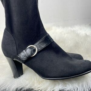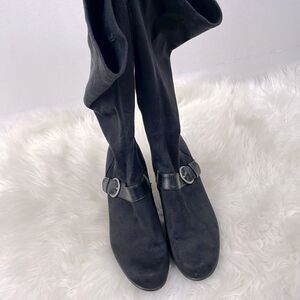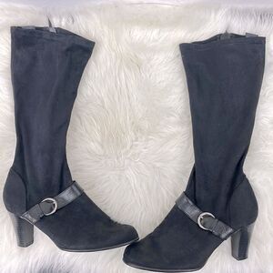 Predictions | black suede buckle stretchy boots 3” heel ,tall under knee…