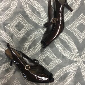 Predictions shiny brown peep toe buckle heels 9.5 like for price drops and cheaper shipping promotions or just make an offer NWOT