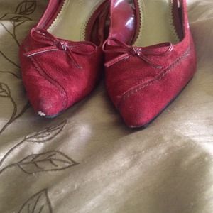 Deep red suede sling back with patent scalloped trim, matching handbag. Fits size 9.