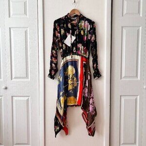 Preen Line multicoloured crepe de chine dress Contrasting print, pintucks at front and back, tie and button-fastening neck, button-fastening cuffs, elasticated waist, waterfall hem Slips on