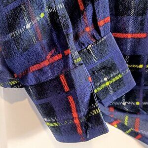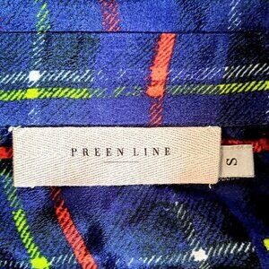 Pure silk sheer long-sleeve blouse from Preen Line in a deep navy blue, red and green plaid print.