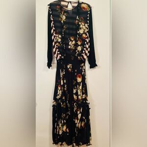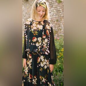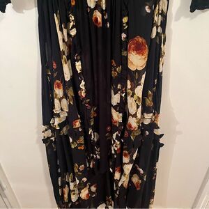 Chic black dress with vibrant floral design. Features long sleeves and elegant flow.