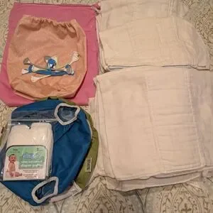 Prefold cloth reusable diaper set of 16. Purchase will also come with six fasteners, two wet bags, and seven reusable diaper covers. The diaper covers are medium and large sizes. You will need to purchase additional covers and overnight inserts. I personally liked the Nora and Esembly brand covers. The inners have some light staining and fraying but overall in good condition and ready to support their next family. We loved our cloth diapering journey and hope you do too.