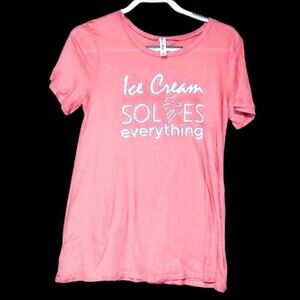 Pregnancy pink tee shirt with printed words "Ice Cream Solves Everything" in white.This tee shirt stretches with the stomache as the stomache grows,Comes in Small,Medium,Large,XL. #enceinte.