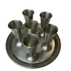 Preisner Pewter No.2023 Tray 8 inch and 6 Cordial Goblet Cups 3.75 inches Tall