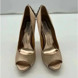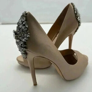 Pre-loved Badgley Mischka Kiara Nude Beige, in Good condition, signs of wear on the sole, but nothing on the satin, minimal signs of use, no missing rhinestones.