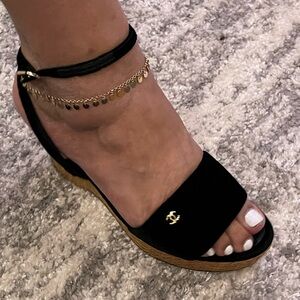 Pre-loved Chanel open toe ankle strap velvet black size 38 has been worn once and the left bottom of side has a bit worn but no too noticeable.. I do have a picture to show. Please ask me questions before purchasing. Happy shopping 🛍️
