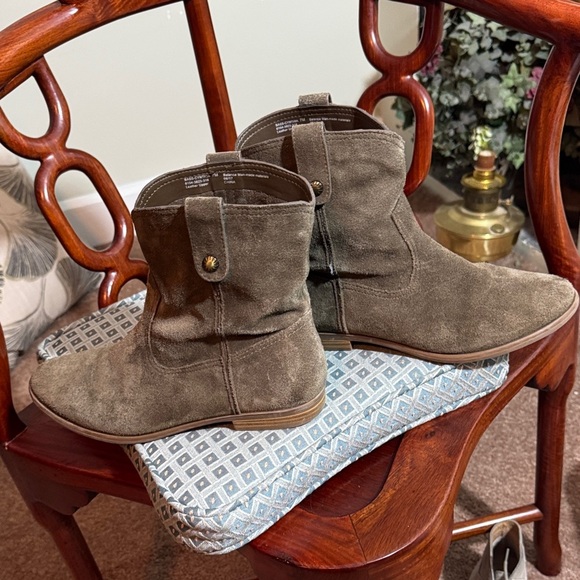 Stylish suede ankle boots by Bass. Perfect for versatile wear. Slight discoloration on the seam not ripped. Can be touched up easily.