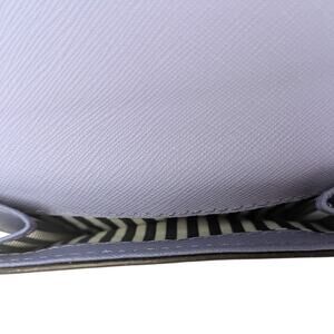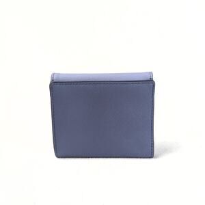 Exterior: Sky blue & navy saffiano leather. Gold-tone hardware. Slide pocket at the back.