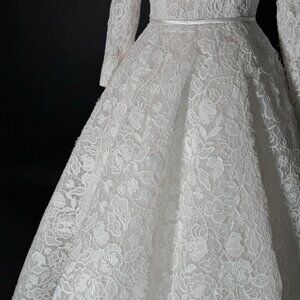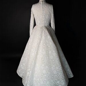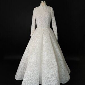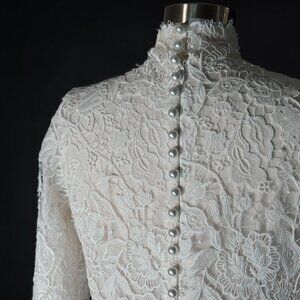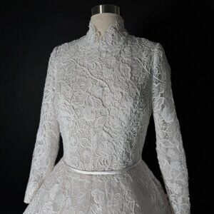 This Anna Augusta Modest Bridal Gown is a refined choice for the bride seeking grace and elegance. Gently used and available in size US 6, this gown features delicate long sleeves and a soft V-neckline, providing a sophisticated silhouette. The gown boasts a dropped lower waist adorned with intricate Guipure Lace, complemented by a luxurious blush lining. Pearl buttons trail down the back, adding a touch of classic beauty, while a silk belt cinches the waist for a flattering finish. This one-of-a-kind gown ensures you'll feel like royalty on your special day.