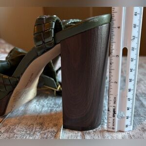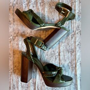 Olive Green mixed textures of braided, woven and knotted leather bring rich visual intrigue to a soaring ankle-strap sandal lifted by a supportive block heel and platform.