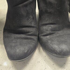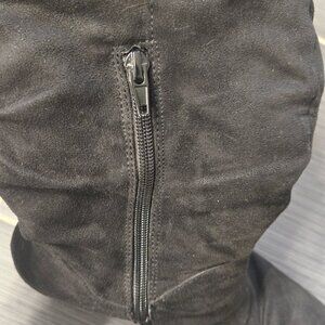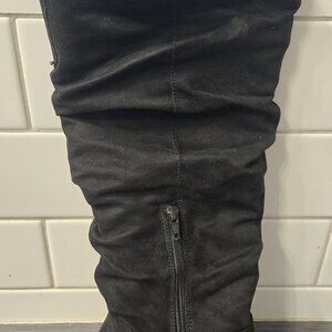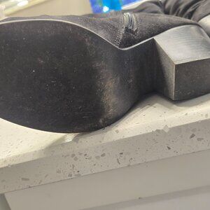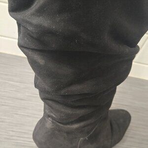 These pre-loved slouchy black boots are super comfy and perfect for winter. Wear them over leggings or jeans or with your favorite dress.... anyway you want! Size 8M. Fabric upper. Chunky heel. I tried to show any scratches, stains, etc. They are definitely worn, but in decent shape. Nothing that really shows when you are wearing them or affects the wearing of them. Please See All Photos As They Are Part Of The Item Description And Condition. AS IS.