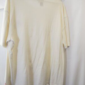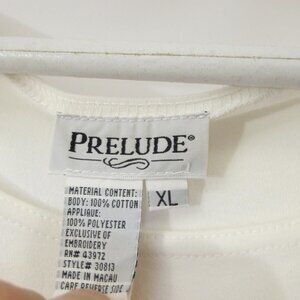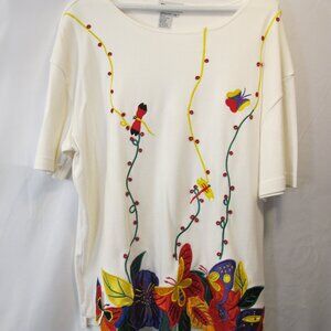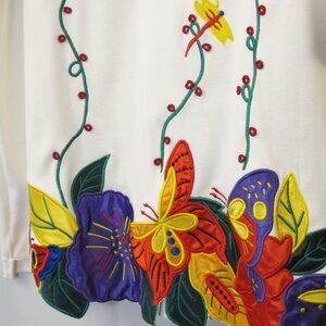 Prelude white short sleeve top with applique flowers, butterflies, and other insects in bright red, blue, yellow, green, and purple. Yellow soutache “tendrils” with red berries extend from the top down to the flowers at the bottom of the shirt. Does not appear to have been worn