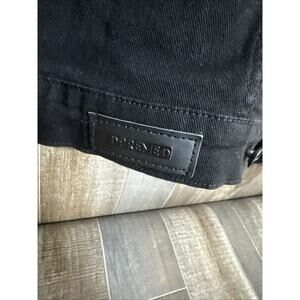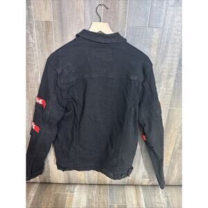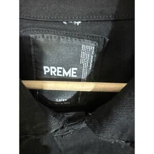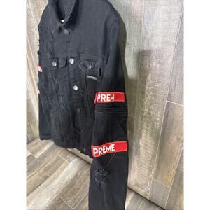 The "Preme Black Jean Jacket Distressed Size Large" is a men's urban style jacket made of cotton with a distressed black color. It features a button closure and is lined with cotton for comfort. The jacket has a regular fit in size large and is designed with a Jean brand aesthetic. This jacket is suitable for everyday wear and adds a stylish edge to any outfit, perfect for those looking for a versatile and trendy outerwear option.