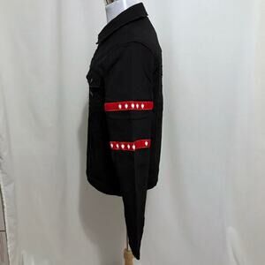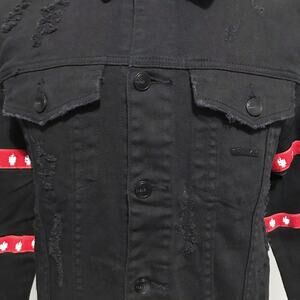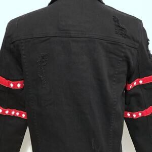 NWOT. Black Wash Jean Jacket for Men Size M. Buttons for closure, buttons on cuffs, long sleeves, 2 top pockets with buttons for closure, 2 bottom side pockets, 2 internal pockets, distressed, red fastener style with "skull" graphic all around, patch brand logo back bottom right. Please note, there are no material/care tag. This brand is known for its unique urban style. Pictures are part of description.