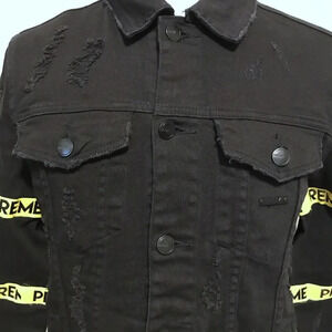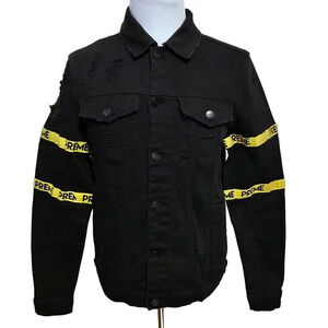 NWOT. Black Wash Jean Jacket for Men Size M. Buttons for closure, buttons on cuffs, long sleeves, 2 top pockets with buttons for closure, 2 bottom side pockets, 2 internal pockets, distressed, yellow fastener style with "Preme" all around, patch brand logo back bottom right. Please note, there are no material/care tag. This brand is known for its unique urban style. Pictures are part of description.