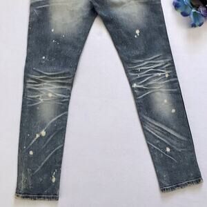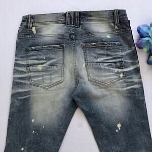 NWOT. Distressed Medium Wash Skinny Jeans for Men Size 32. Zipper and button for closure, 5 pockets design, has loops, trim sides = pink, white, black, "bleach splatter" design throughout. Please note there are no material/care tag. This brand is known for its unique urban style. Pictures are part of description.