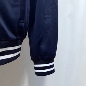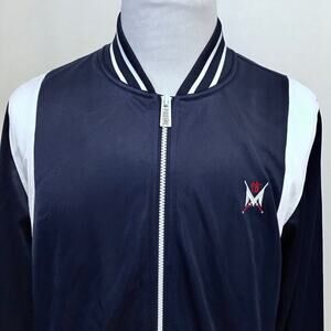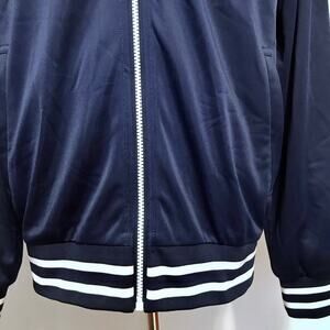 NWOT. Track Jacket for Men Size L. Full zip, navy and white, 2 side pockets, long sleeves, elastic and stripe collar, cuffs, and bottom hem, embroidered graphic front top left. Please note, there are not material/care tags. Pictures are part of description.