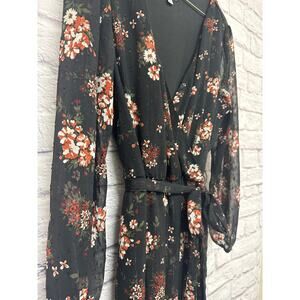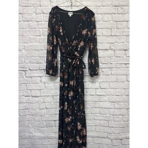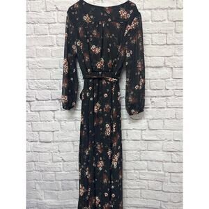 Premier Amour Black Floral Long Sleeve Wrap Maxi Dress Tie Belt SZ 14
