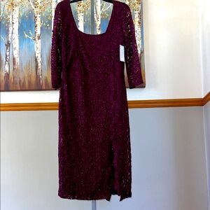 Premier Amour Elegant Lace Burgundy Dress-This elegant lace fully lined body dress in a rich burgundy hue with slight sparkling is perfect for any special occasion. The intricate lace detailing and scalloped front slit add a touch of sophistication and style. Scoop neckline with lace sleeves and back zip closure. Size 12, NWT!