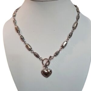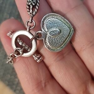 Gorgeous high quality necklace featuring a gold and silver tone chain with a togle clasp and heart pendant