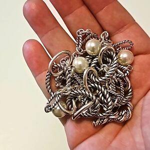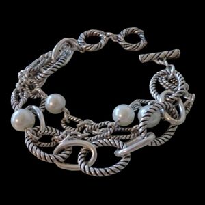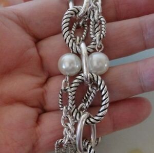 Antiqued silver plated with faux pearls, it is 8-8.5 inches long. It features 3 strands with adjustable toggle clasp