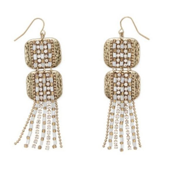 3 1/4” earrings. Lite weight, gold plated, unique, intricate beadwork, and white seed beads