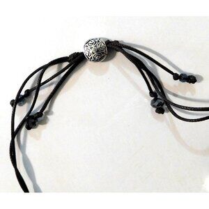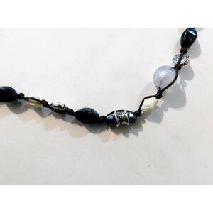 This adjustable necklace combines antiqued silver plating, glass, acrylic, and beads on a durable cord. The sliding knots offer a versatile fit.