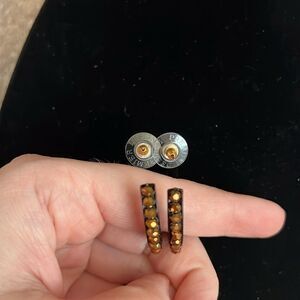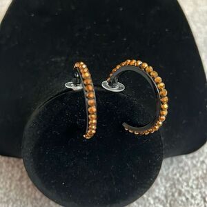 Measure approximately 1 1/2 inches long. Premier designs brand. Black hoop earrings with copper stone beading. Brand new in bag