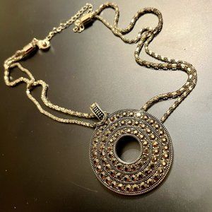 This is a Premier Designs silver tone double strand rope necklace with a large detachable pendant (magnetic clasp).The pendant is truly lovely with lots of sparkle due to all the marcasite stones in it. The chain is in excellent preloved condition (approx 19:) and the pendant is also in great condition (all stones intact), except for having worn off a little silver on the back of the magnetic clasp.