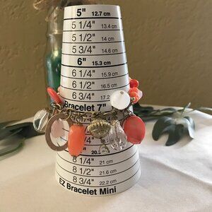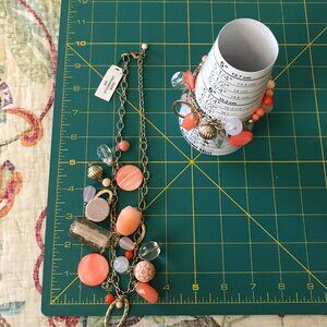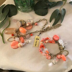 Beautiful peach and pink tone dangle necklace and stretch bracelet. Antique gold tone chain with a mix of beautiful beads, crystals and hammered metal rings. The necklace measures 16 inches with a 4 inch extender. The bracelet measures 7 inches. The necklace has a Premier Design tag attached which looks to have a label placed over it.