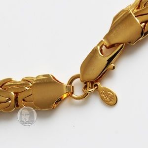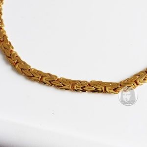 Preowned, vintage gold metal chain necklace, made by Premier Designs most likely in the 80s. Made from a v-shaped chunky chain, it fastens with a lobster claw clasp and it measures 18in long. Preowned/vintage with some signs of prior use and wear: some scratching here and there, hard to see when wearing but evident if inspecting closely.