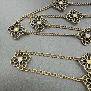 This stunning Premier Designs long strand necklace features intricate flower-shaped links adorned with sparkling crystal accents. The beautifully crafted brass chain in gold tone adds timeless elegance.