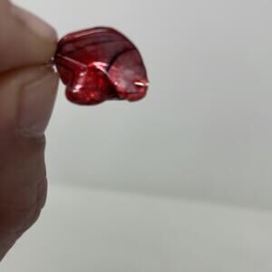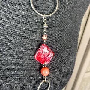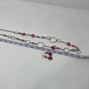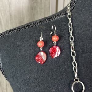 Hanging red beaded earrings and matching long strand silver tone necklace