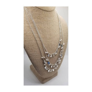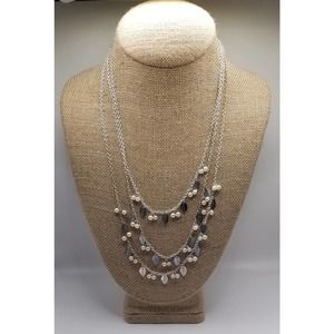 Multi stand, silver plated, 3 layered necklace from Premier Designs. Features pearlized beads and engraved detailing to form leaves. Measurements can be provided upon request.
