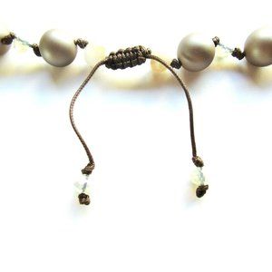 This beautiful necklace by Premier Designs has faux pearls and faceted quartz beads. The faux pearls have a tan-ish hue, the faceted quartz beads are a sort of blush tone. They are strung on a dark tan knotted cord with a macrame knot. By pulling on the knot it is adjustable from 38”-42”. It is in perfect condition. The Luster necklaces are always unsigned.