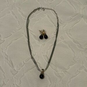 This set is 2-toned (silver and gold tone). The necklace is two stranded and measures 18” with 2” for adjusting the length/drop. The earrings are posts with plastic backs to keep earrings from dropping backward. This is a quality set that was sold through home parties.