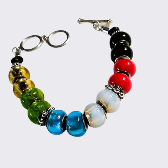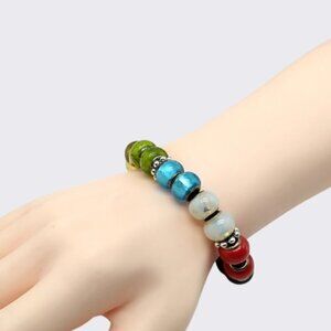 ♦ The bracelet includes colored glass and opalescent beads; yellow, green, blue, white, red, and black and arranged in a Vibrant Chakra-Inspired Design