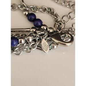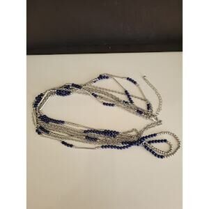 Premier Designs True Blue necklace has 4 strands of silver tone chain, bars and beads and navy blue beads. Adjusts from 36 to 40 inches with a lobster clasp. Very good condition. Design has been retired.