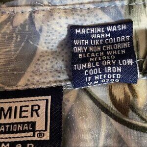 Premier International Tropical Short Sleeve Button Down Shirt. 100% Polyester. Size Large with approximate measurements laying flat: 25" pit to pit, 31.5" in length.