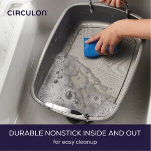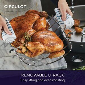 The Circulon Nonstick Bakeware 17-Inch by 13-Inch Roaster with U-Rack makes it simple to create holiday roasts, family feasts, and more. With its convenient chrome-plated U-shaped rack, this oven roaster keeps meats off the bottom of the pan so unwanted fats drip away to the bottom of the roaster. The heavy-duty steel construction promotes balanced heat distribution for superior cooking performance and long-lasting durability while the nonstick roaster has rolled edges for extra strength. The oven roaster also features premium-quality nonstick for excellent food release and easy cleanup. Oven safe to 450°F, this big turkey roaster is a great way to create delicious meals. Roasting turkey, ham, roast beef, chicken and more is easier using the Circulon Bakeware 17-Inch by 13-Inch Nonstick Roaster with Rack.