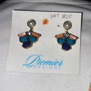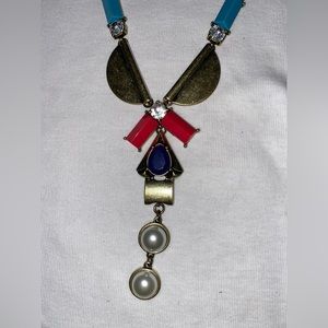 gold necklace with colorful beads and pearls, matching dangle earrings