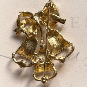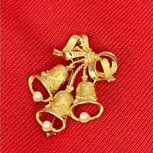 Premier bells & bow gold tone brooch with faux pearls. Perfect holiday accessory.