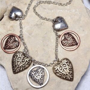 This elegant necklace features intricate heart charms in silver and gold tones, perfect for adding a touch of sophistication to any outfit.