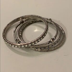 Premier Designs Stacktastic bracelets. Originally 5 bracelets but only have 4. Antiqued matte silver plated, crystals, 8 1/4” bangle bracelets. Preloved has wear.