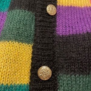 Tunic length sweater fully lined Premiere 50%Acrylic 50%Wool long sweater with vivid colored front , black sleeves and back. Beautiful gold tone button front. Great overall condition Except for a tear in the inner lining as in the picture.