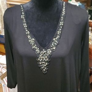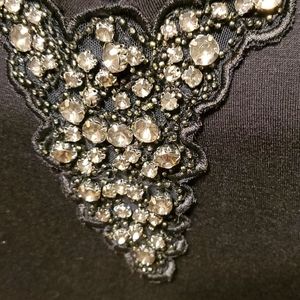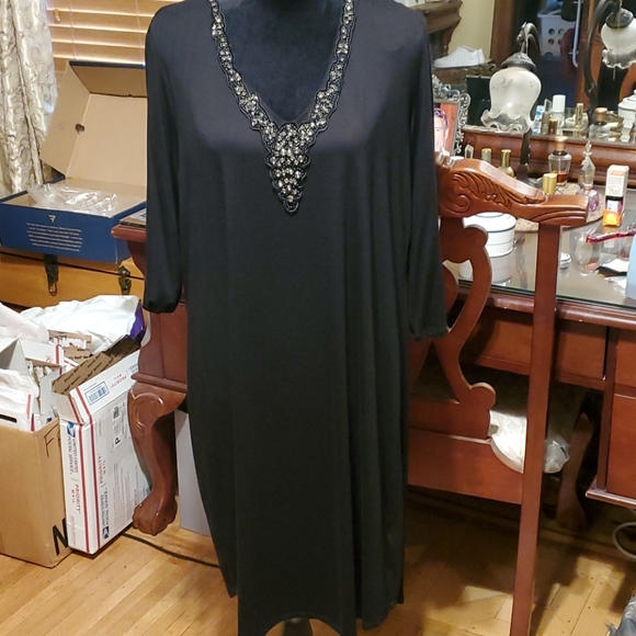 Black dress with rhinestone embellishments on the front bodice. Size OX. Straight line with half sleeves. Just over the knee.
