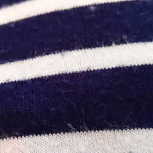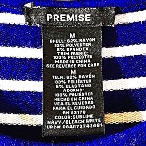 cute and trendy this premise medium top/blouse has short sleeves rounded neckline. dark navy blue and white stripes. has a inverted chiffon fleet in the back with a ruffle on the bottom. very stretchy and comfortable to wear.